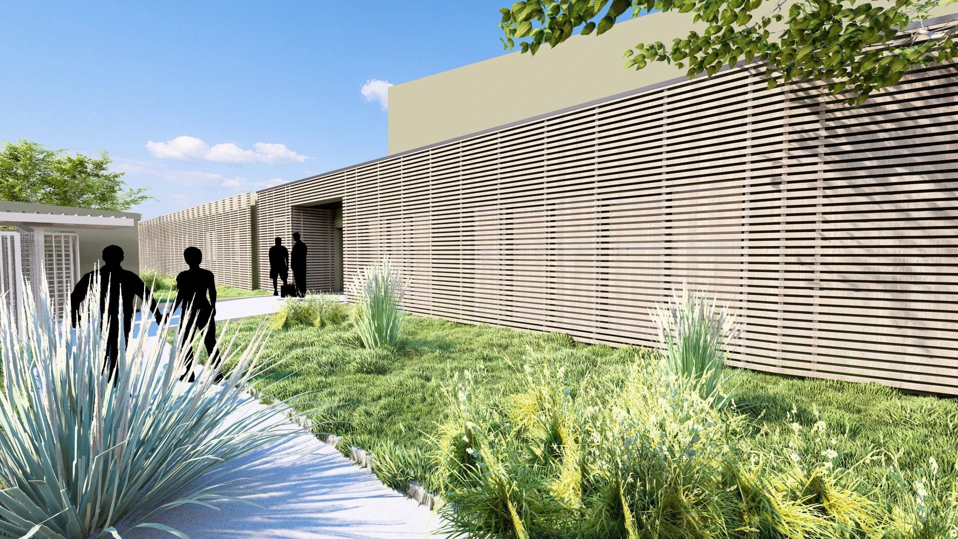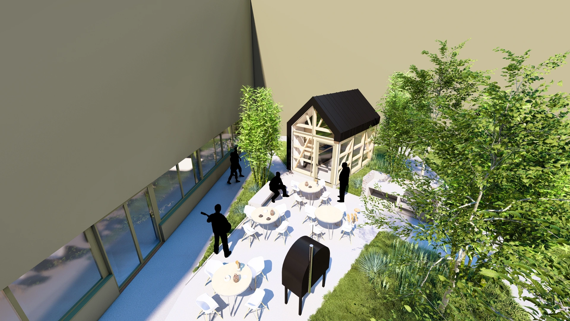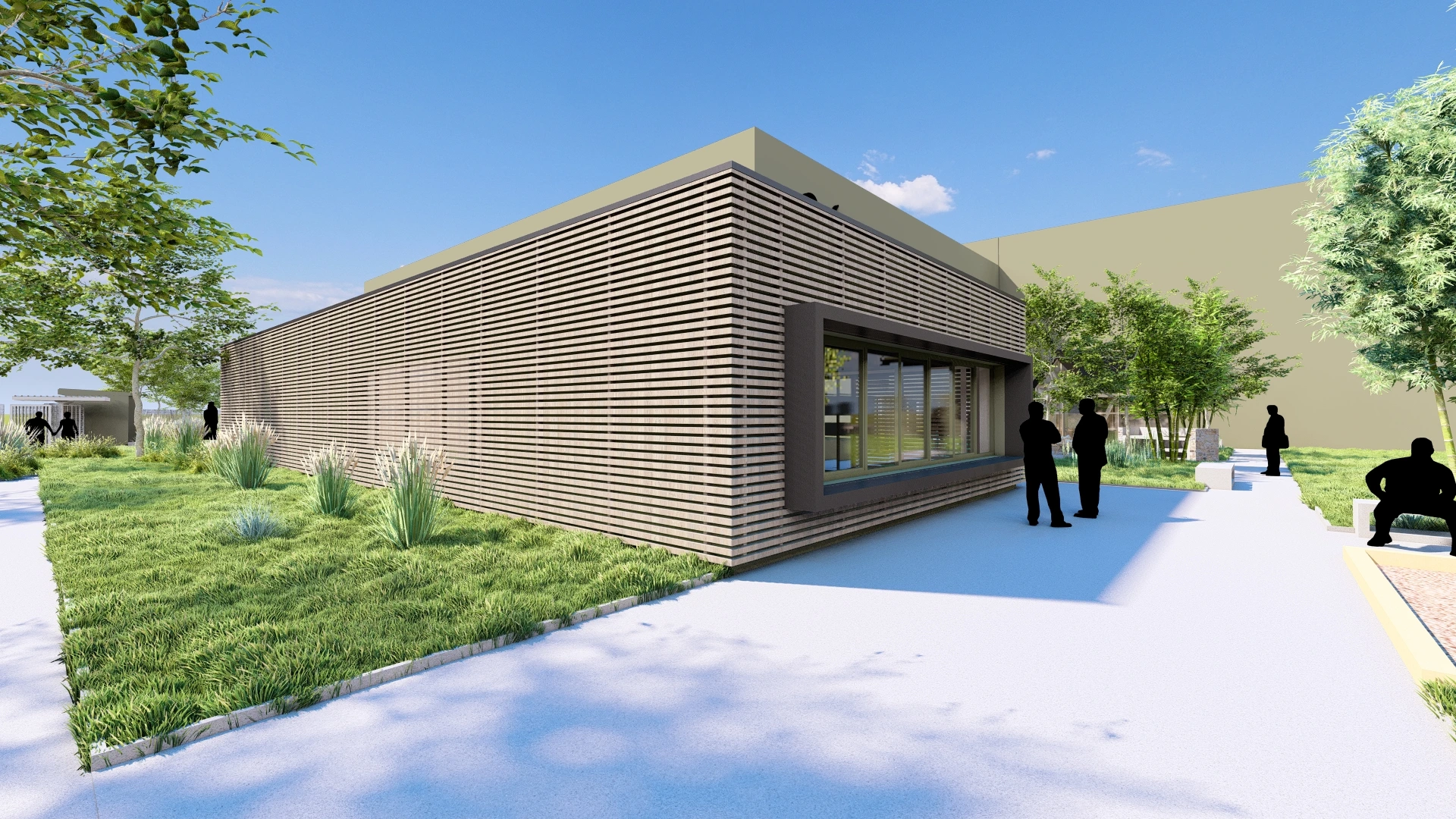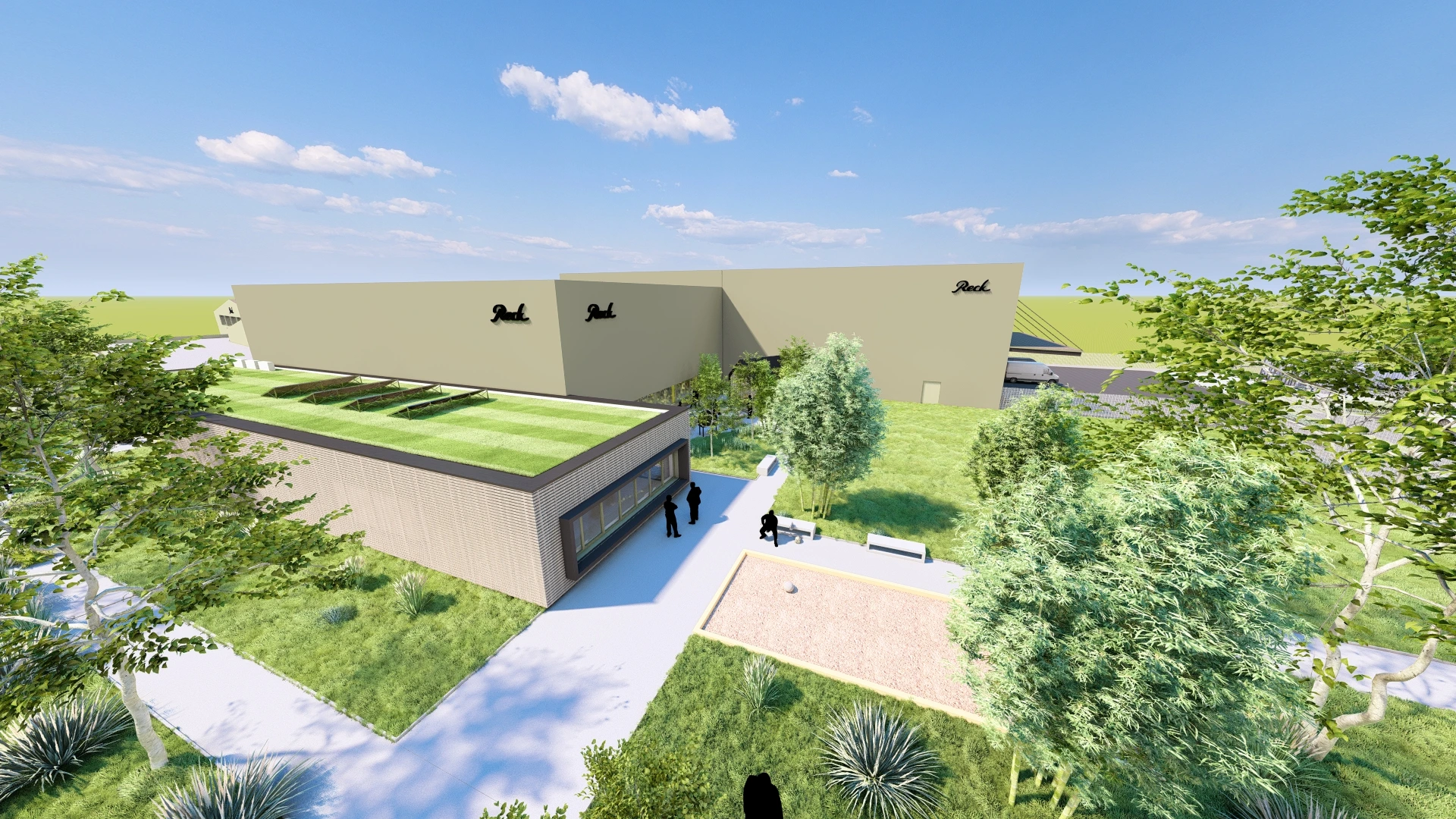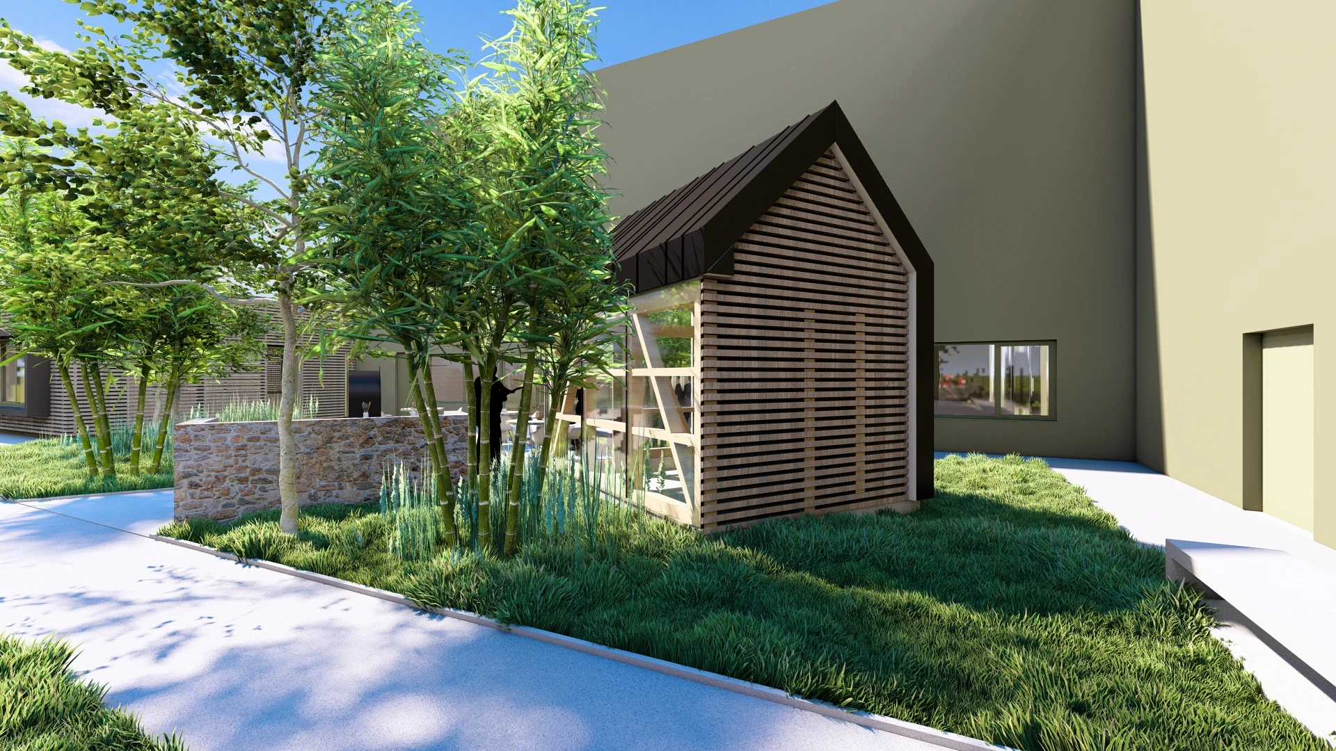 En complément de cette extension, une cour de détente a été aménagée à destination des salariés. Véritable espace de respiration au cœur du site, elle se présente comme un lieu de convivialité et de repos, favorisant les échanges informels et le bien-être au travail. Le traitement paysager, sobre et soigné, privilégie les essences locales et les matériaux naturels, en cohérence avec l’esprit du lieu.