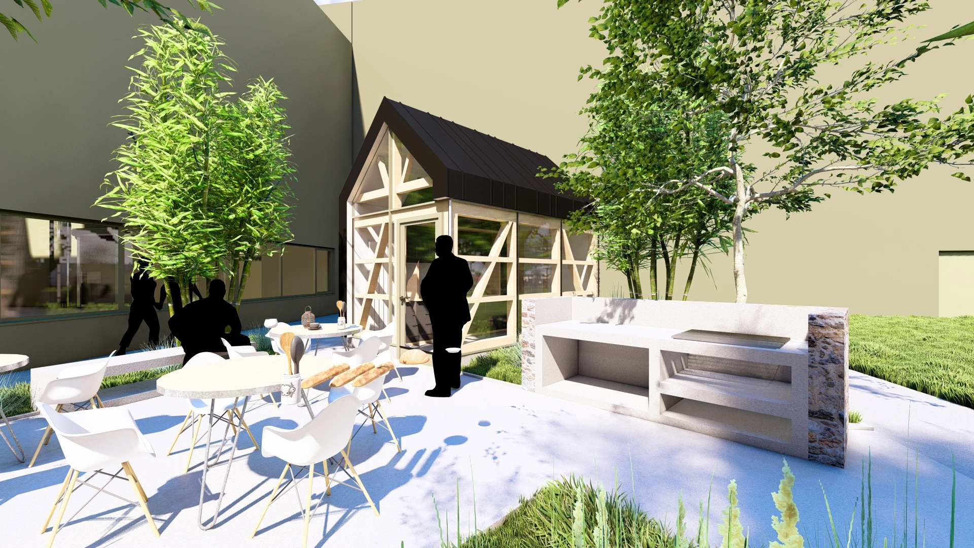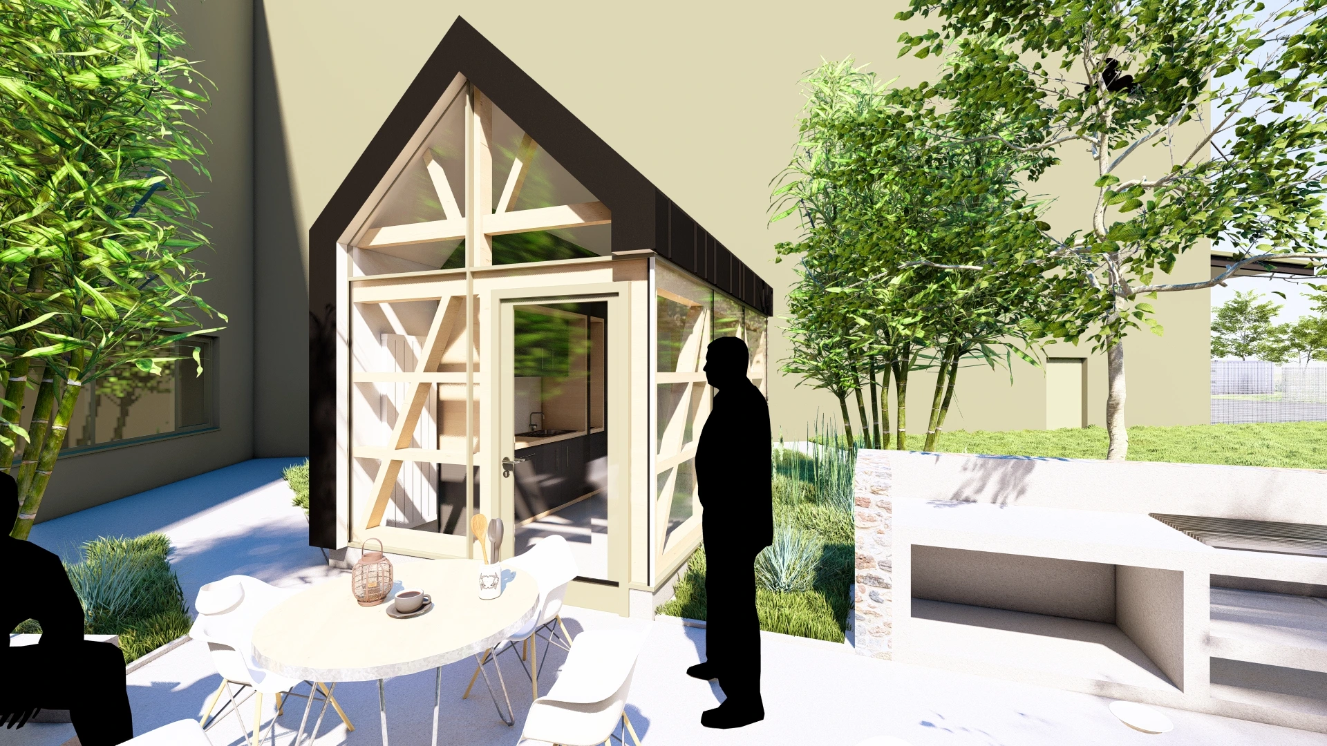 Un petit édifice, abritant des éléments de cuisine et d’agrément, vient compléter cet aménagement. Conçu comme un clin d’œil à l’architecture vernaculaire alsacienne, il revisite les codes traditionnels tels que le colombage, réinterprétés dans un langage architectural contemporain. Ce jeu subtil entre tradition et modernité crée un dialogue harmonieux entre héritage et innovation, ancrant le projet dans son contexte culturel tout en affirmant son époque.