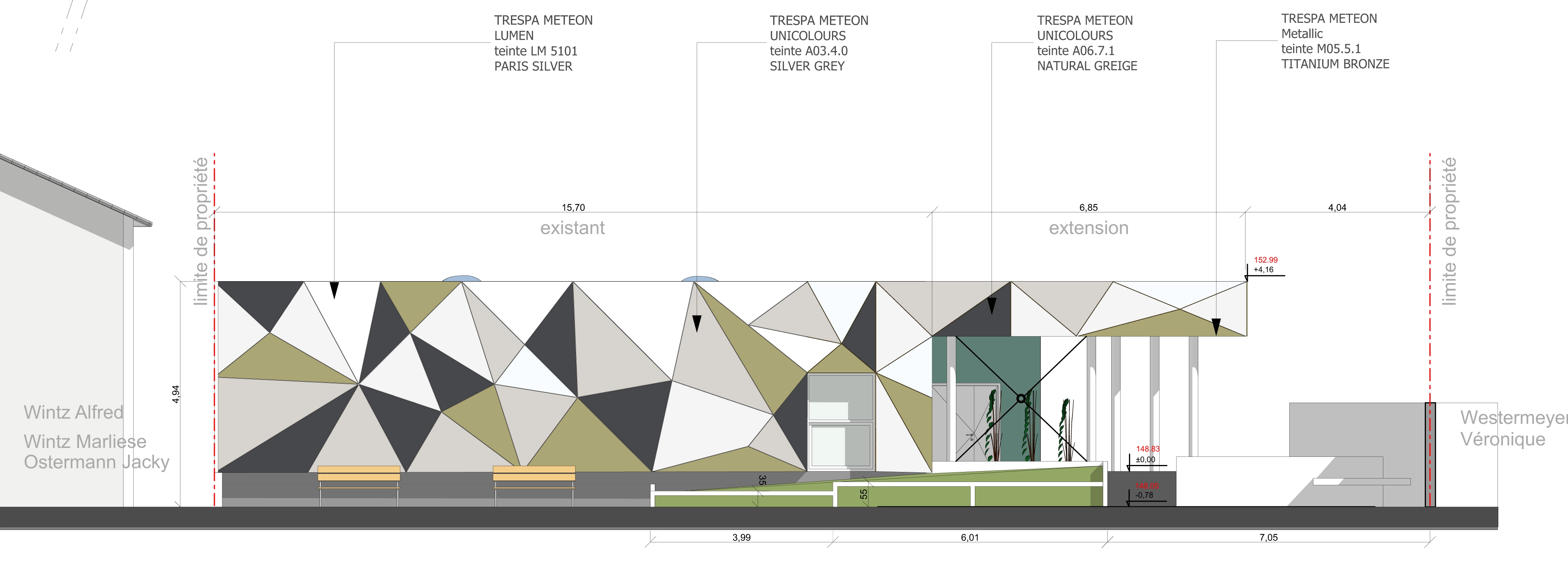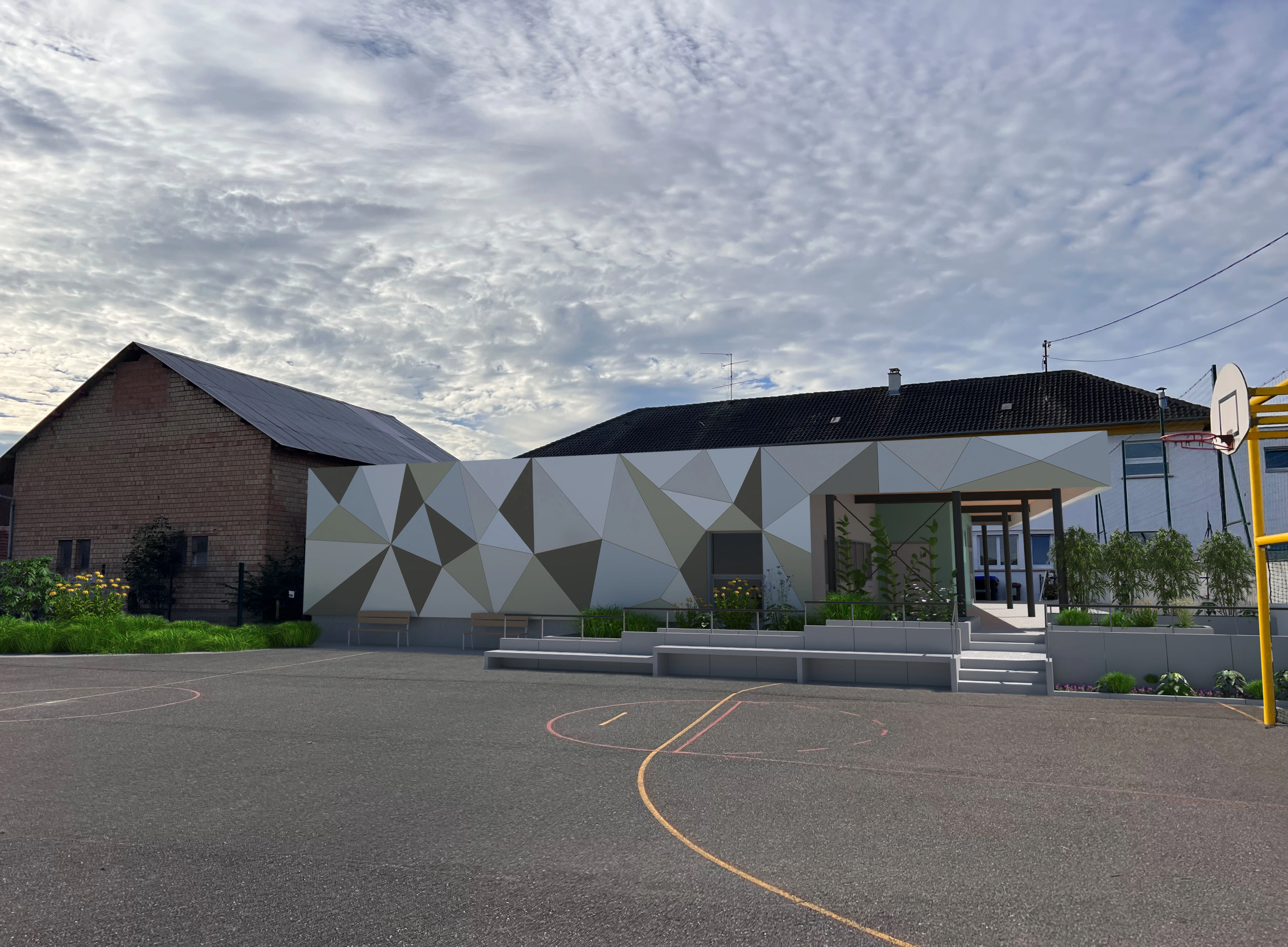 Conçu comme une extension harmonieuse et identifiable, le Préau constitue une intervention d’ensemble sur le bâtiment. L’écriture architecturale de cette extension puise son inspiration dans l’univers de l’origami, dont les plis et les tensions génèrent une géométrie expressive et dynamique. Cette approche confère à l’ensemble une dimension à la fois graphique et ludique, en parfaite résonance avec l’esprit d’un lieu dédié à l’enfance. Les surfaces du volume introduisent une lecture plus contemporaine et sensible de l’école. Ainsi, le Préau de l’école Germain Muller ne se limite pas à un simple abri fonctionnel : il devient un signe architectural fort, une figure poétique et contemporaine, traduisant la vitalité et la modernité de l’établissement tout en célébrant la créativité de l’enfance.