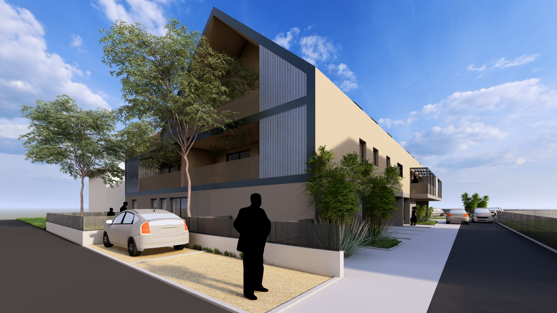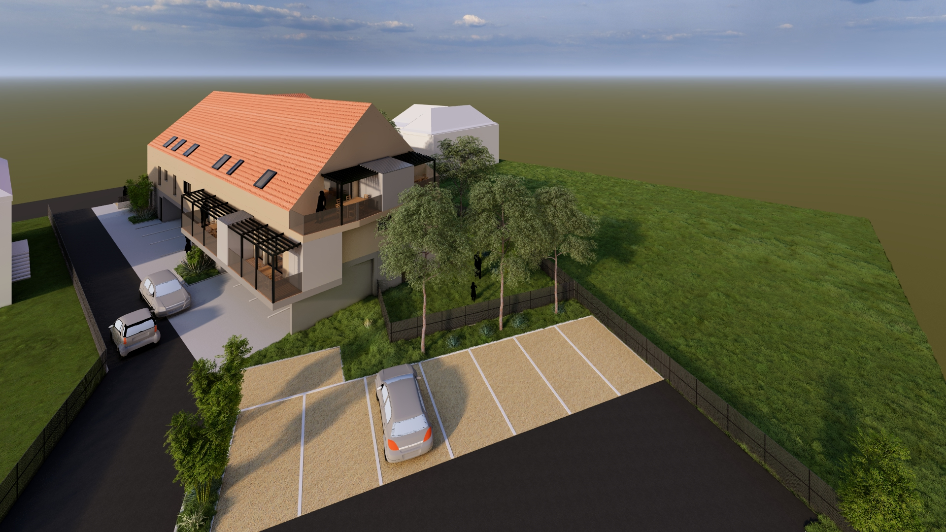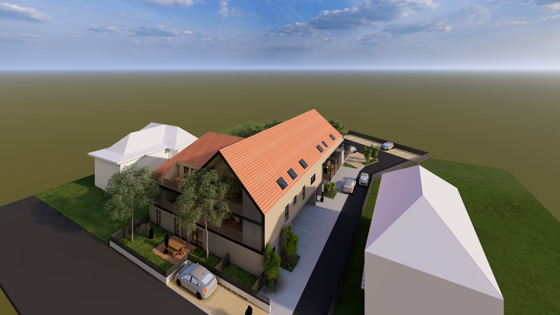Le projet s’attache à s’inscrire avec la plus grande justesse dans son environnement immédiat, en conciliant harmonieusement les exigences du site et les orientations réglementaires issues du PLU. Bien qu’il procède d’une optimisation foncière rigoureuse, il se distingue par une volonté affirmée de préserver la qualité architecturale et le confort d’usage. Les logements ont été conçus avec un soin particulier porté aux qualités spatiales : proportions équilibrées, circulations maîtrisées, apports lumineux généreux et organisation intérieure lisible. Chacune des unités bénéficie d’un espace extérieur privatif, terrasse, balcon ou jardin, permettant une continuité sensible entre l’intérieur et le paysage, et renforçant ainsi l’agrément de vie des futurs occupants. Le plan, résolument clair et structuré, témoigne d’une intention méthodique et d’une recherche attentive de cohérence constructive. L’ensemble constitue une opération à la fois rationnelle et élégante, où l’optimisation foncière ne se fait jamais au détriment de la qualité architecturale ni du bien-être des habitants.