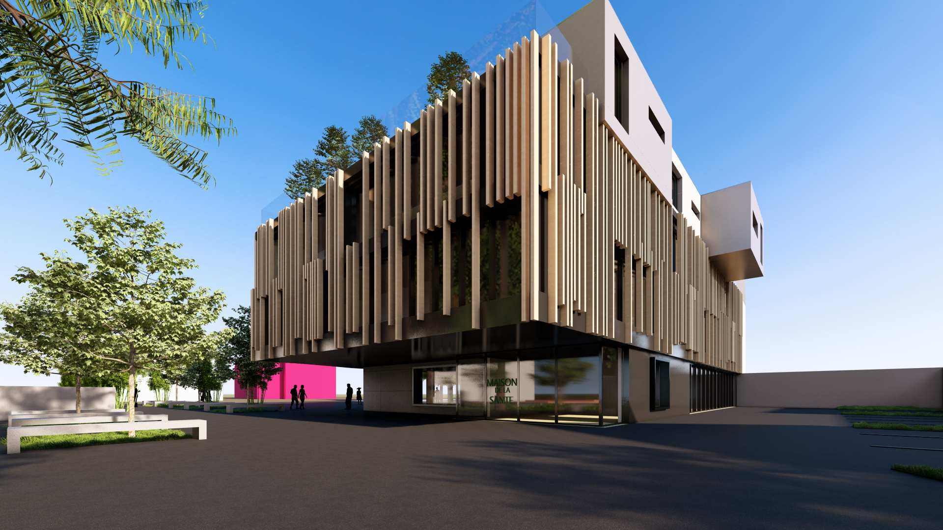 L’architecture du bâtiment se distingue par une expression volontairement introvertie. La façade, rythmée par un jeu de claustras, filtre les vues et instaure un rapport mesuré entre espace public et espace de soins. Ce dispositif confère à l’édifice une identité singulière : à la fois protectrice et accueillante, elle offre aux usagers une intimité nécessaire tout en préservant la transparence et la présence urbaine du lieu.